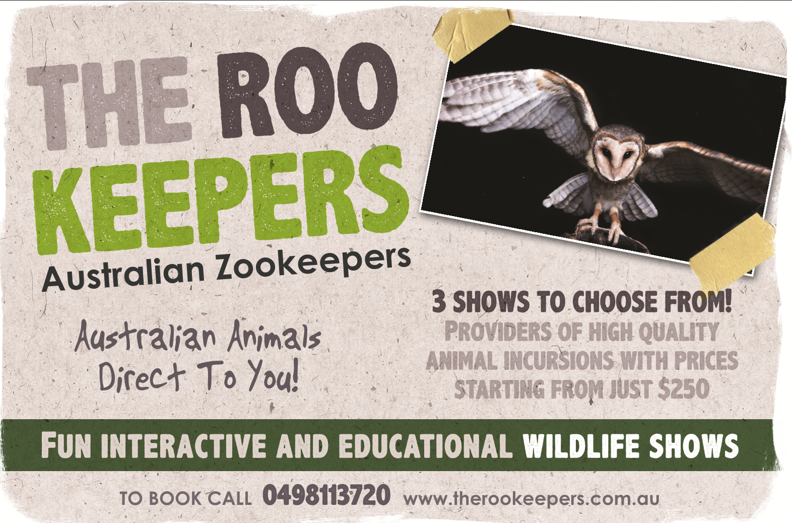 Founded in 2012 by wildlife enthusiast Michael Church , The Rookeepers have grown to be one of Victoria's leading wildlife education companies, and presents interactive wildlife shows for early learning centers, kindergartens, primary schools and kids parties. Our zoo has a wide range of Australian native animals including reptiles, birds, mammals and marine life which are all hand raised or tame to make your wildlife encounter much more personal.