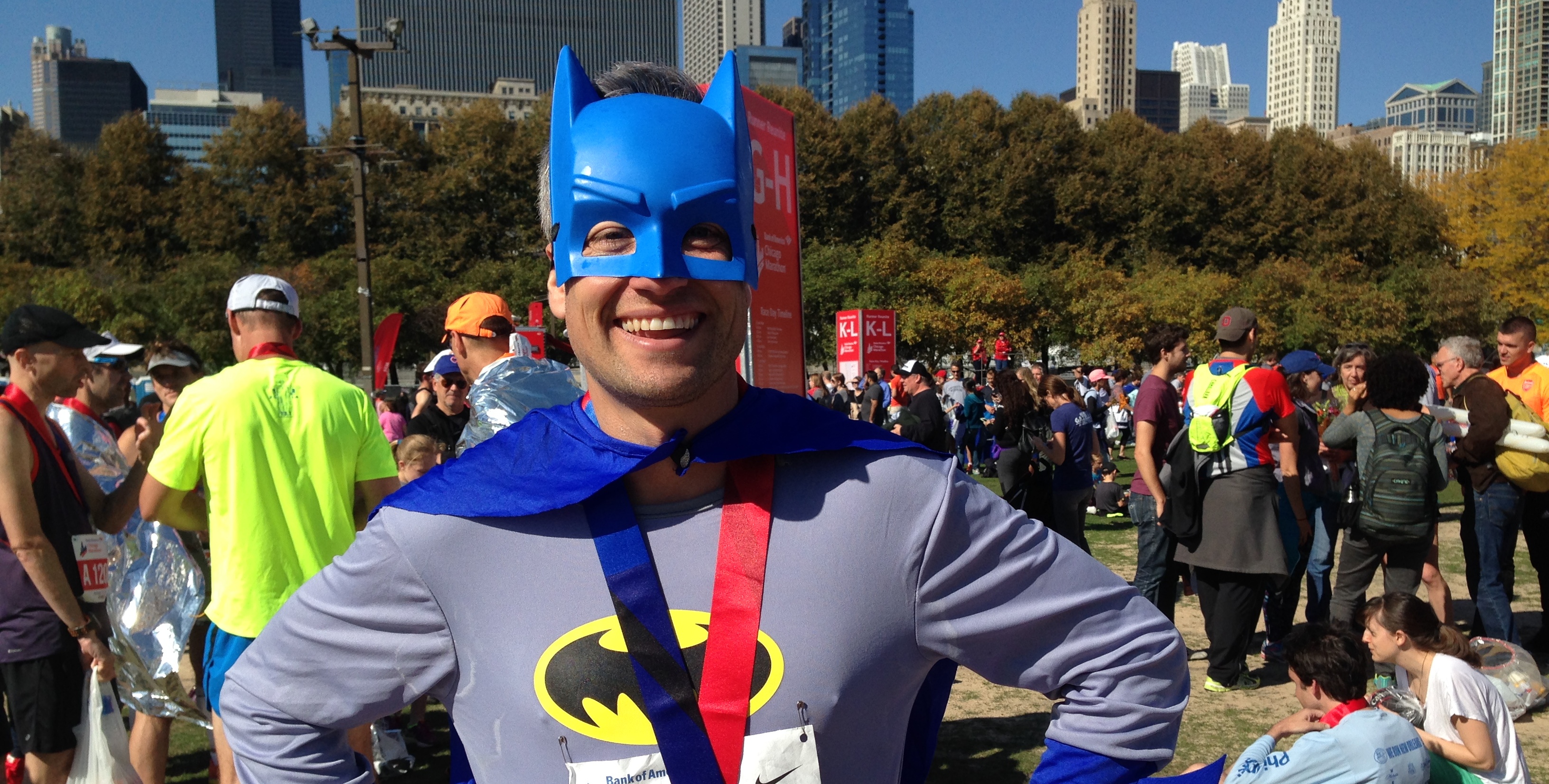 Donning his Batman costume and cape, the supremely fit educator and part-time crime fighter has just finished the Chicago Marathon ...