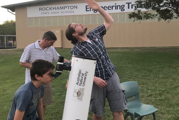 ANU astronomer Brad Tucker shows students from Rockhampton High School how to use their powerful new telescope. PHOTO: ANU Media