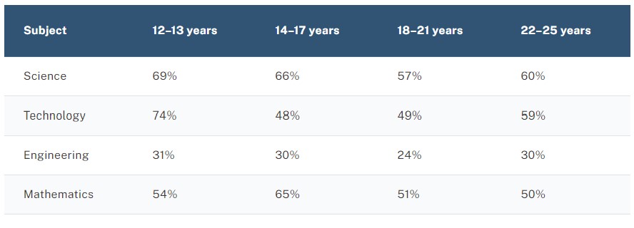 The table above shows girls’ confidence in STEM subjects at different ages. (Source: STEM Equity Monitor)