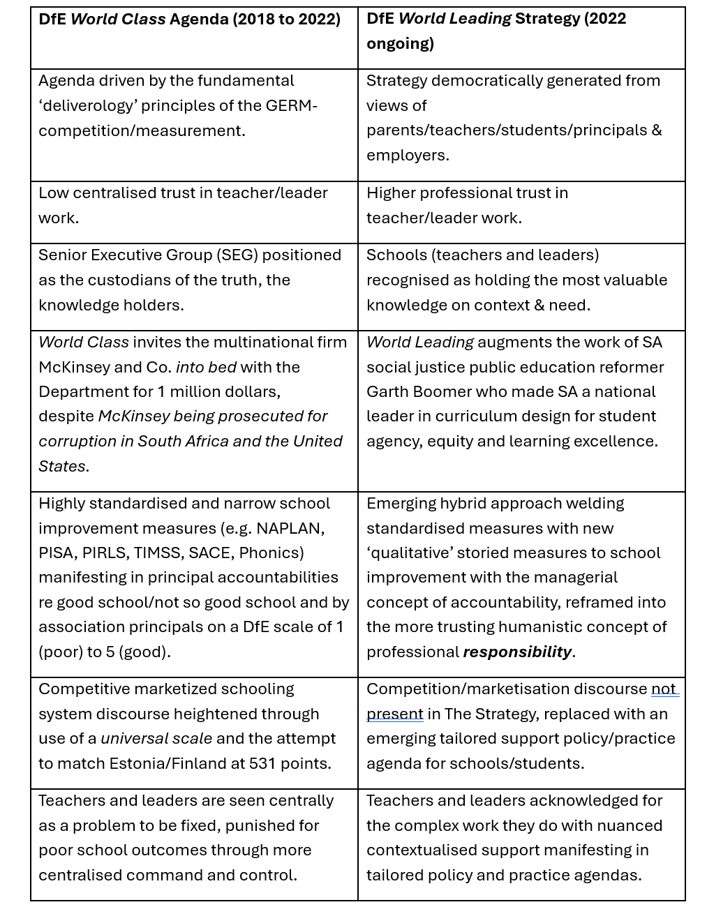 This was to achieve ‘World Class’ status by 2028, as defined by McKinsey, with restrictive school improvement policy solutions engineered within the paradigm of the GERM.