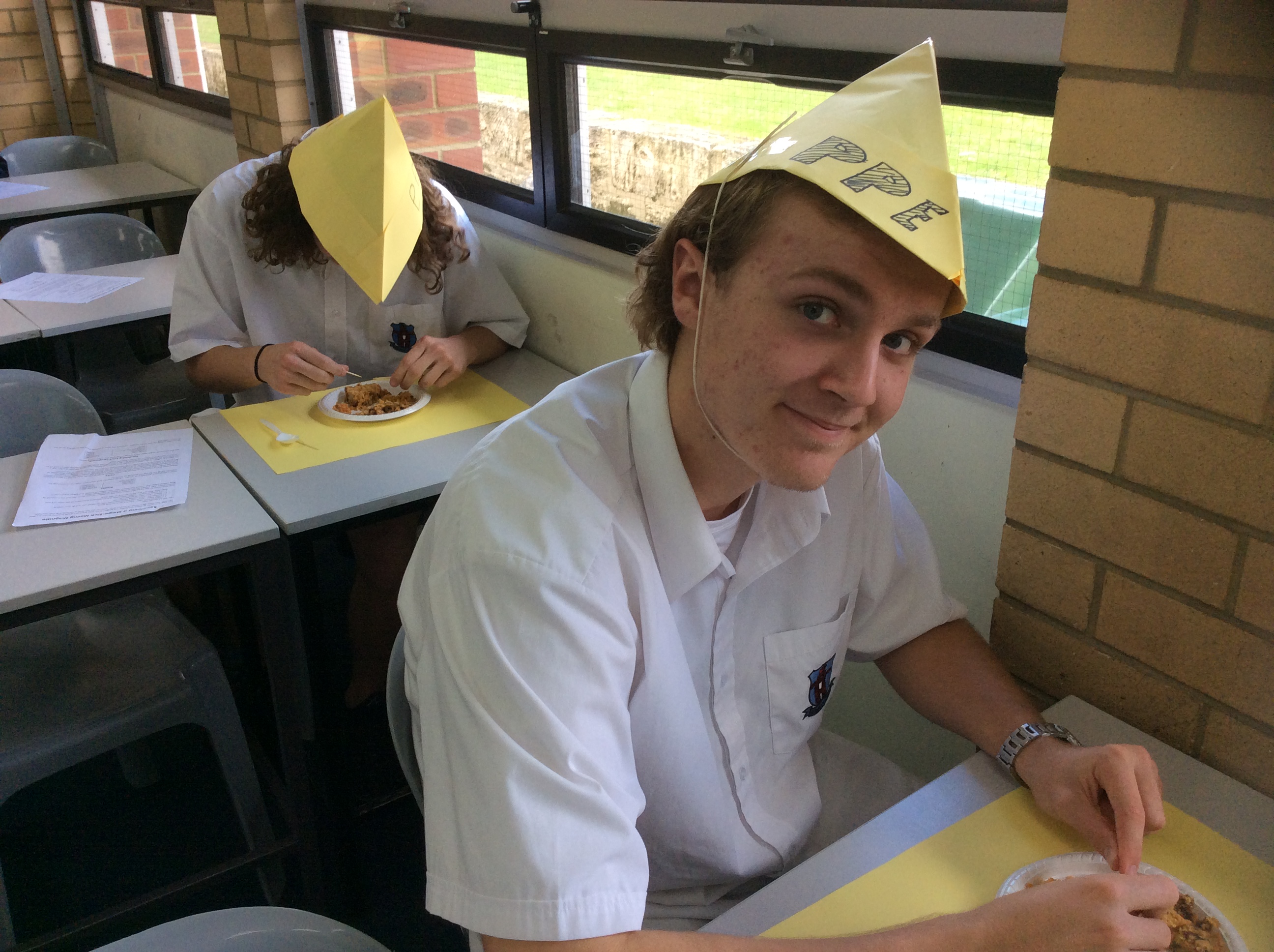 Students sporting paper hats stoop over their partially dissected slices of fruitcake, carefully extracting their sugary loot with toothpicks.
