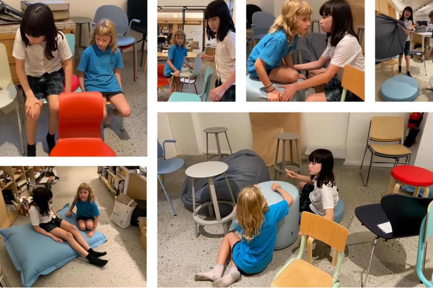 Students testing educational furniture at Hayball’s studio.