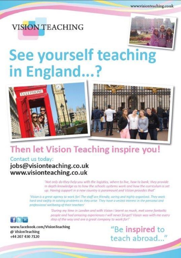 Vision Teaching is a UK based teacher recruitment agency, we are based in London, England. Currently we are recruiting for a number of teachers to join our staff in 2016 and 2017; we have a variety of full time contracts and substitute teaching contracts available.