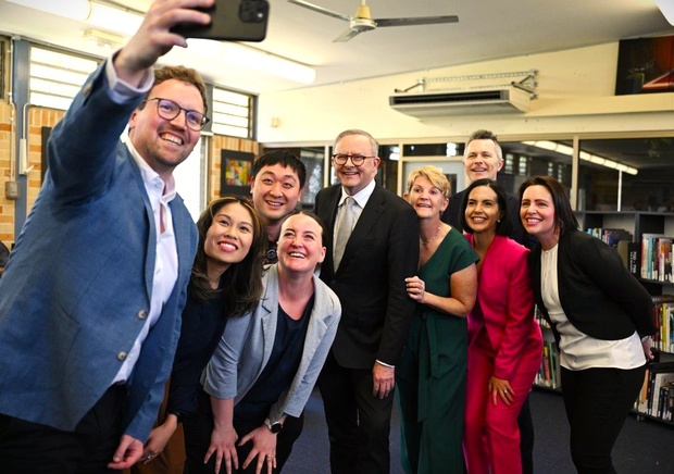 PM Anthony Albanese joined the campaign's featured teachers for a selfie during the launch today at Kirrawee High School in Sydney. PHOTO: AAP