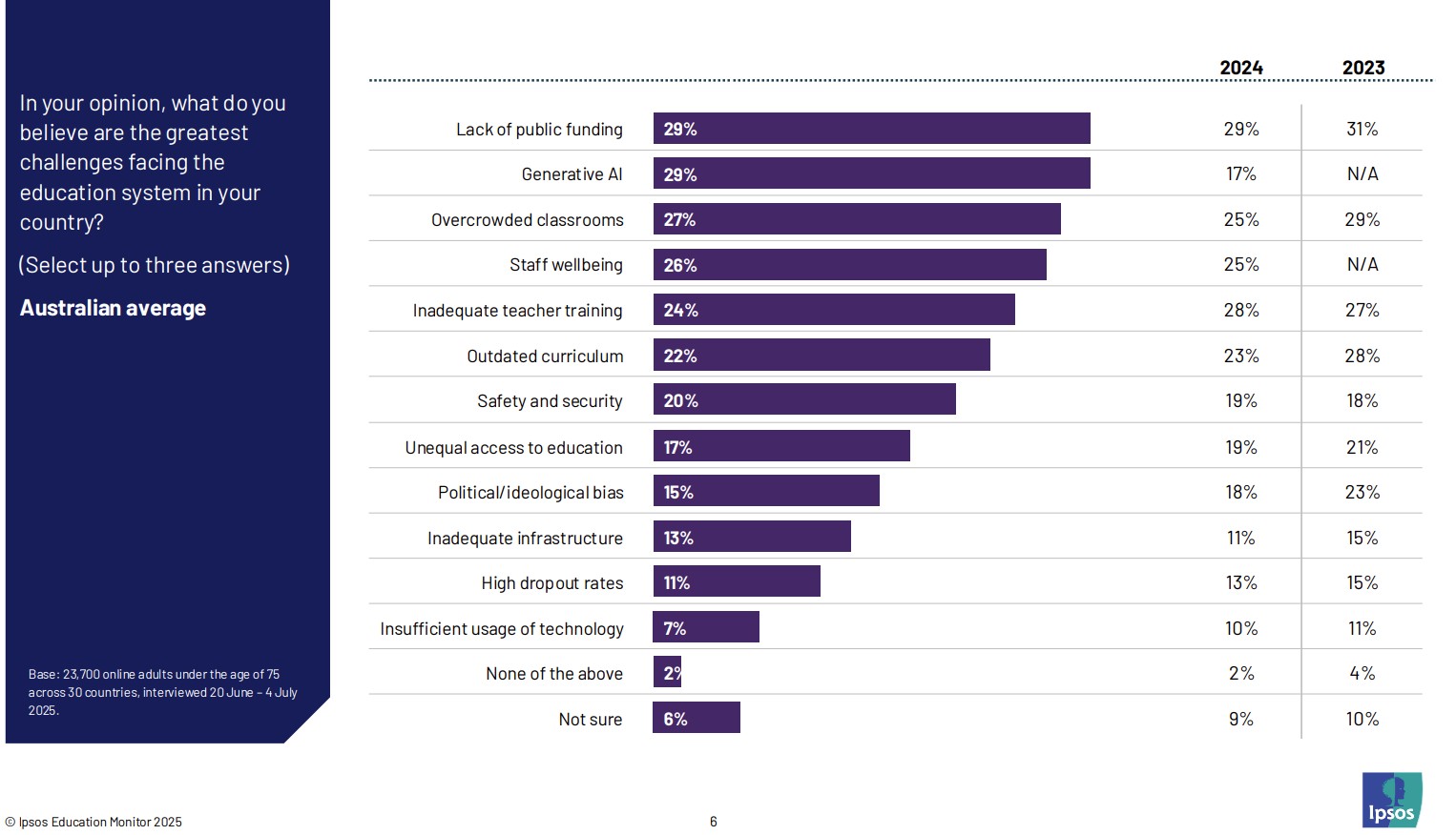 In terms of the main perceived challenges for the system, lack of public funding (29 per cent) rated highly, along with Generative AI (29 per cent), overcrowded classrooms (27 per cent); and staff wellbeing (26 per cent) topping the list.