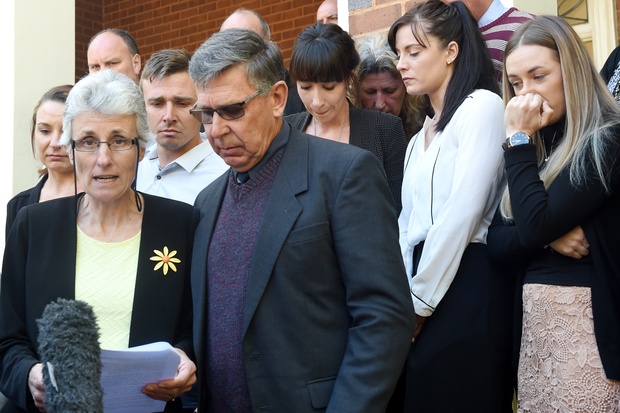 Stephanie Scott's mother, Merrilyn, reads out a heart-wrenching statement outside Griffith Local Court after Justice Hulme handed down the life sentence.
