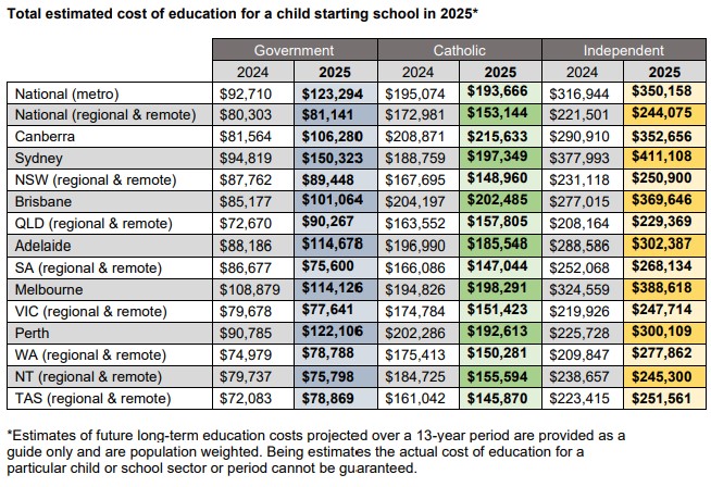 It is forecast the total cost of a Government education in regional and remote Queensland will be $90,267 over 13-years for a child starting school in 2025, a 24 per cent increase compared to last year.