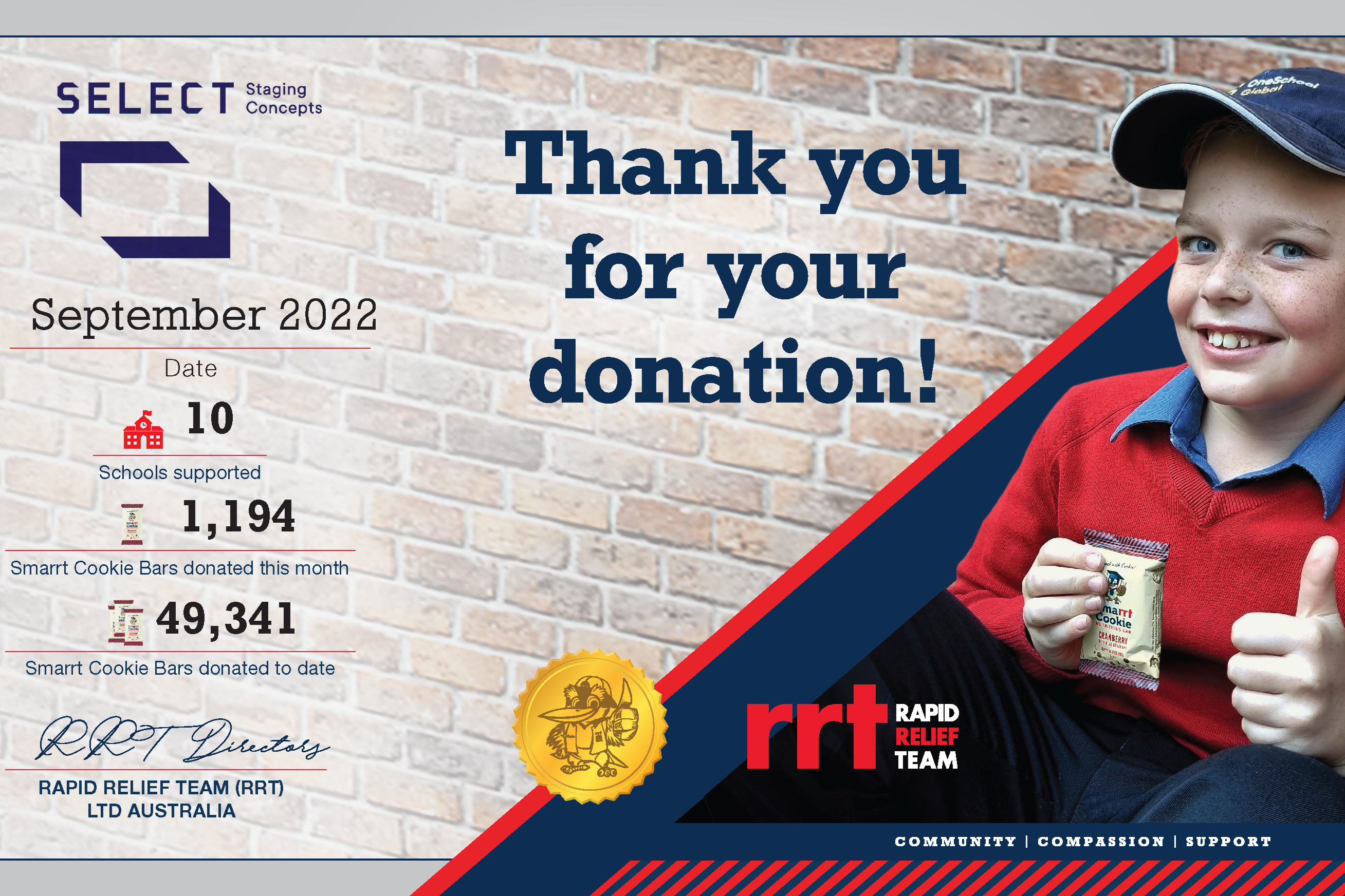 Select Staging Concepts donates money from our own profits to help fund Rapid Relief Team’s (RRT) Smarrt Cookie Initiative.