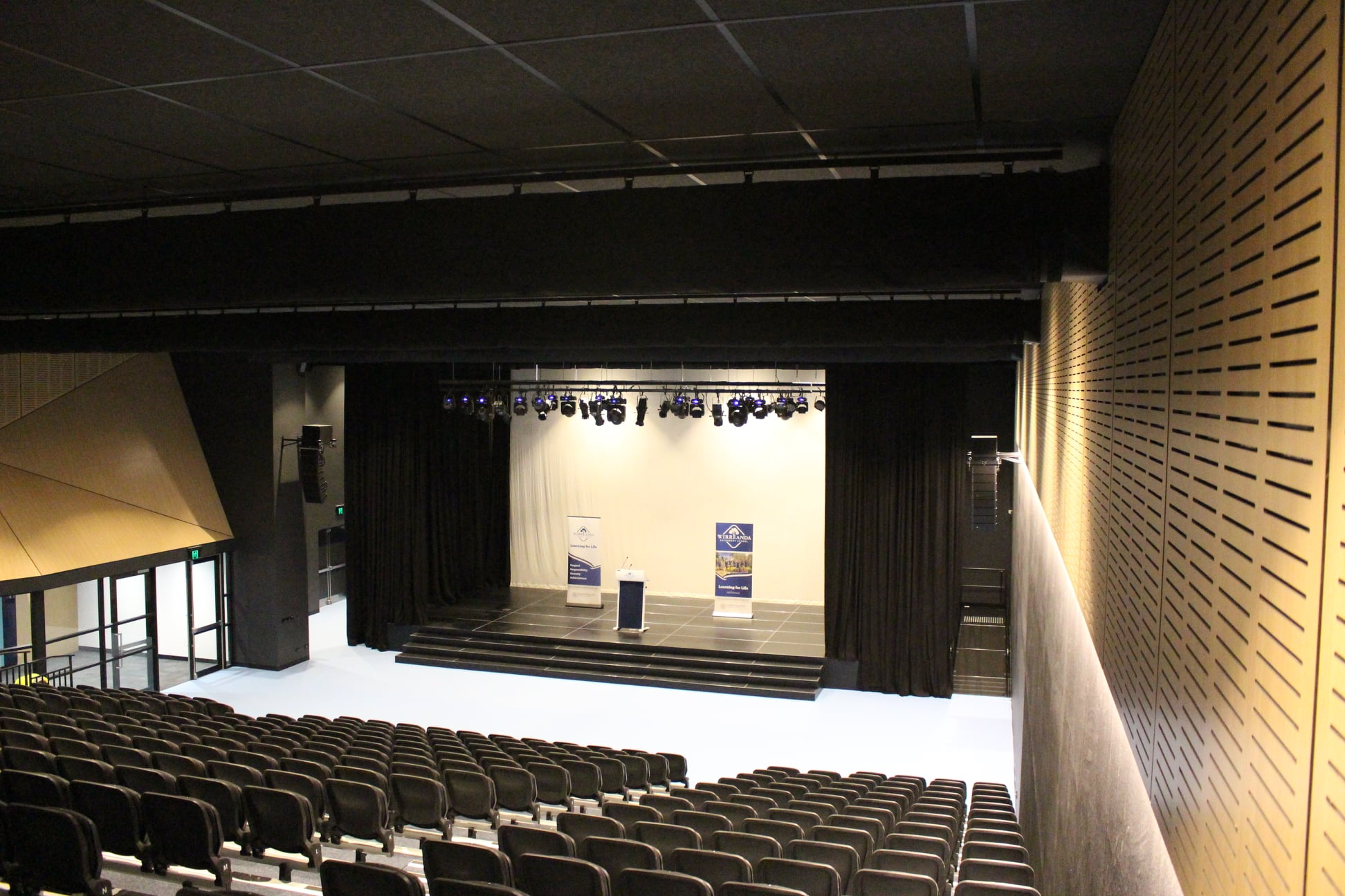 In the past, the school community hired the beautiful Hopgood Theatre, and so desired a new school Theatre with professional curtaining to frame the Stage and Ramp. Our curtain system partners, Reveal Productions, provided a great team to assist design and install a complete ceiling Curtain Truss system prior to the full Stage, Access Ramp and Curtain system install.