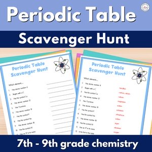 Are you introducing the periodic table to your 7th to 9th grade science students? They will love using the periodic table scavenger hunt game - a set of three differentiated worksheets which challenge students to use their knowledge of the first 20 elements in the period table to answer the questions. Perfect for a chemistry lesson or small group rotations on the periodic table for 7th grade to 9th grade science or to support older science students with additional needs, the periodic table scavenger hunt is a fun activity to get students thinking and talking while they learn.